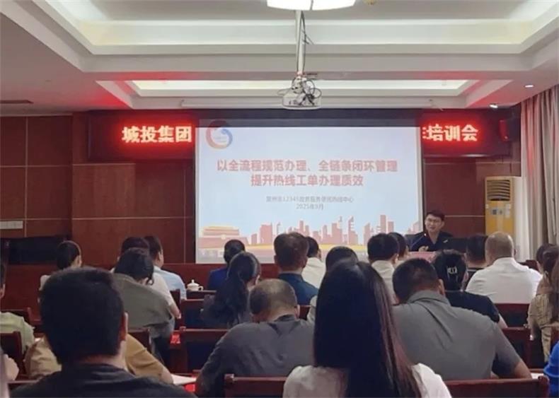 為切實提升12345熱線工單辦理質效,更好回應群眾訴求,9 月 24 日,城投集團組織召開 12345 熱線工單辦理工作專題培訓會。集團黨委副書記、職工董事、工會主席陸劍如主持會議,市 12345 熱線中心干部康作偉、話務班班長高時受邀授課并開展現場答疑,集團各子公司分管領導、部門負責人及工單承辦人員共計30 余人參加培訓。